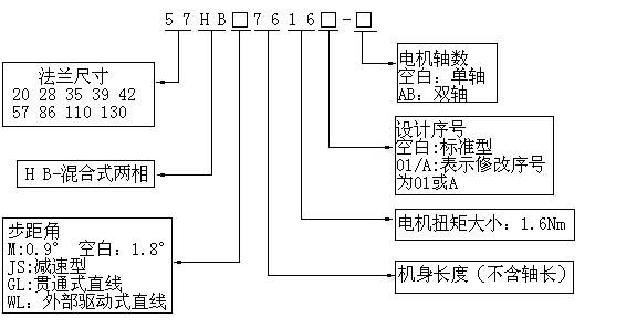 上例表示機座號為57mm,兩相混合式,步距角為1.8度,機身長76mm,扭矩1.6Nm,單邊出軸的電機。