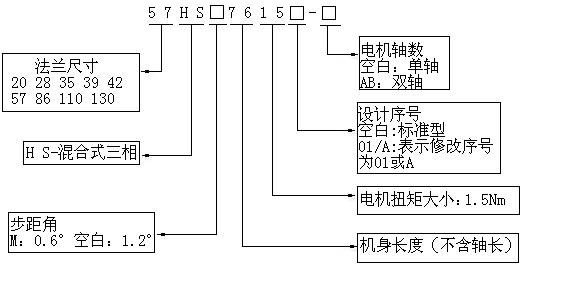 上例表示機座號為57mm,三相混合式,步距角為1.2度,機身長76mm,扭矩1.5Nm,單邊出軸的電機。